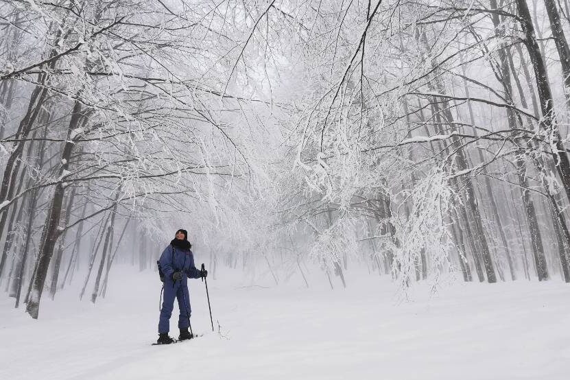 Erika, guida escursionistica locale, ci racconta il fascino di ciaspolare tra i boschi innevati in una giornata di Inverno sul Monte Amiata.